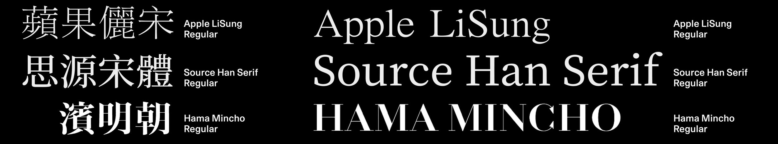 However, three rather successful examples of default pairings allow for a closer understanding of some of the criteria at hand. For example, Apple LiSung incorporates a particularly light weight of Times New Roman which doesn’t exist in the original family of this typeface. Despite the slight incompatibility due to the bracketed serifs and condensed counters, this combination is quite effective thanks to the generous x-height and high-contrast letterforms of Times New Roman. Similarly, Adobe’s Source Han Serif uses a Latin typeface by Frank Grießhammer, which was based on Pierre Simon Fournier’s model but aligns well with Chinese character proportions thanks to a larger x-height resulting from reducing the extenders. Finally, the Latin characters of Hama Mincho are derived from a new rendering of Pierre Didot’s cut. The stroke contrast matches the Ming typeface well, yet the letterforms convey a distinctly different cultural connotation.