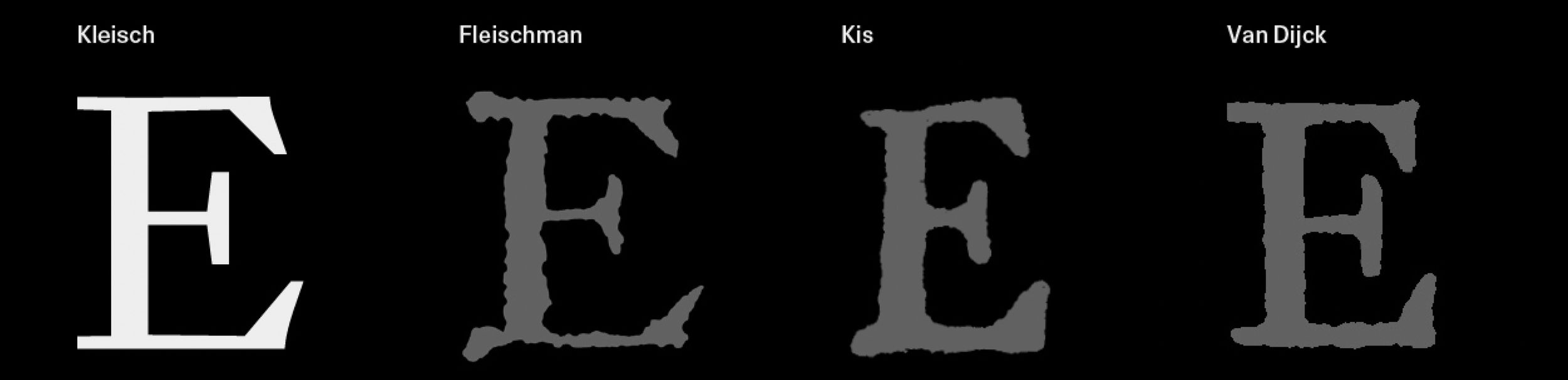 The Baroque ‘s’ is characterised by a slight rotation of the nib on the lower stem, a feature typically softened in the Neoclassical period. The ‘s’ forms in Kis and Van Dijck are marked by asymmetrical terminals. Baroque-style contrast is preserved in Kleisch, while the terminals align with the Neoclassical tradition.