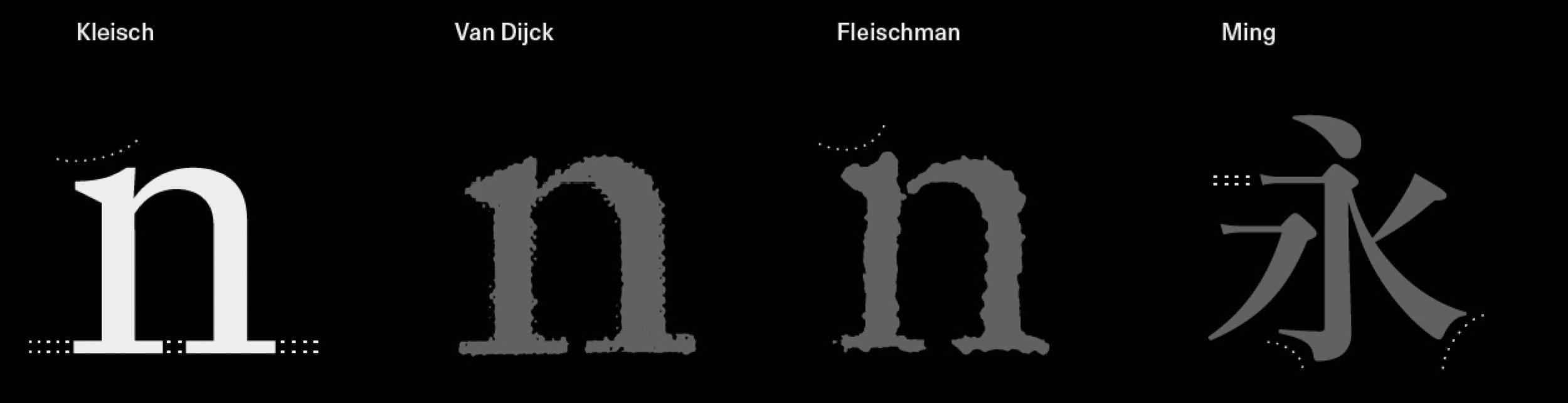 The ‘n’ of Kleisch draws from two models: Fleischman’s dynamic top serifs (also in ‘m’, ‘h’, ‘d’, etc.), reflecting the flexible nib akin to Chinese brush strokes, and Baroque-inspired, high-contrast, bracketless serifs that echo the crisp details in Ming typefaces.